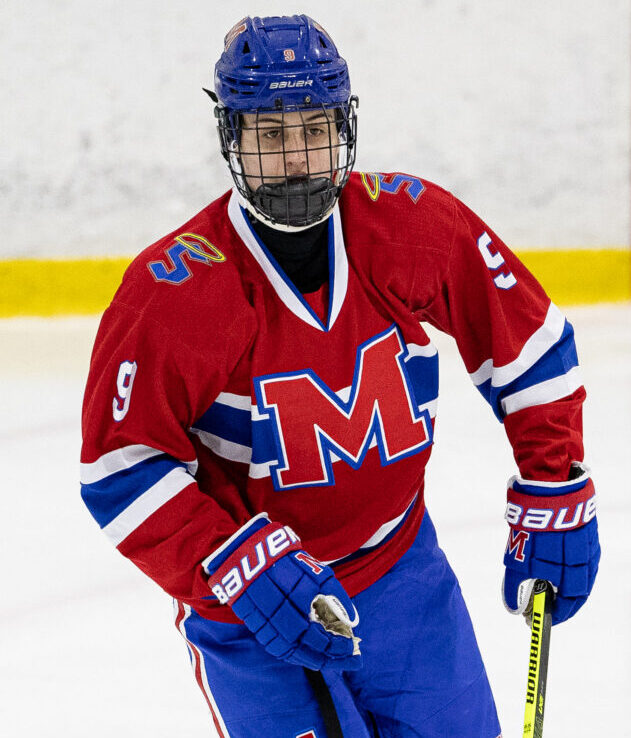 Listed at 6’0 and 154lbs, it is no surprise after hearing that information that Cody Costello was an extremely effective defender at getting his stick in lanes, forcing opponents wide, and taking away shooting and passing lanes. Of course, being tall and lengthy isn’t all that is takes to be an effective defender, his movements, particularly when pivoting from backward to forward skating in an effort to jump up and intercept passes along with get aggressive on puck carriers when defending the zone, made him very valuable and prominent for Mount St. Charles. I felt in the defensive end he had also shown off a nice ability to make quick puck handles to evade forecheckers, make strong passes on both his forehand and backhand, along with get defensive zone clears when his team was under pressure to diffuse situations.
