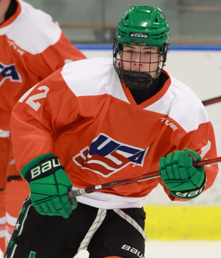 His best game of the camp in my eyes, Jaxson Craig really put all his tools together, combing agile movement with some creative playmaking to set up a handful of nice chances playing with speed. He did a great job at adapting to changes in coverage and the obstacles thrown in front of him. Good footwork synced with some slippery pulls of the puck allowed him to avoid sticks and bodies, spin away from opponents, and connect on the simple play to move the puck. He picked up an assist on the 3-2 goal, stopping up on the right wing, hitting the bumper with the puck, which in turn, found its way in the net. He then picked up another assist on the 4-3 goal, following up a rush chance, catching a drop pass, and ripping a shot on net leading to a rebound chance. As a whole his level of effort and pace was of great significance for Team Orange, he competed hard away from the puck, utilized his soft hands to pull pucks out of traffic, scanned the ice quickly for the next immediate option, and drove plenty of play for his team, even if it wasn’t always the flashiest.